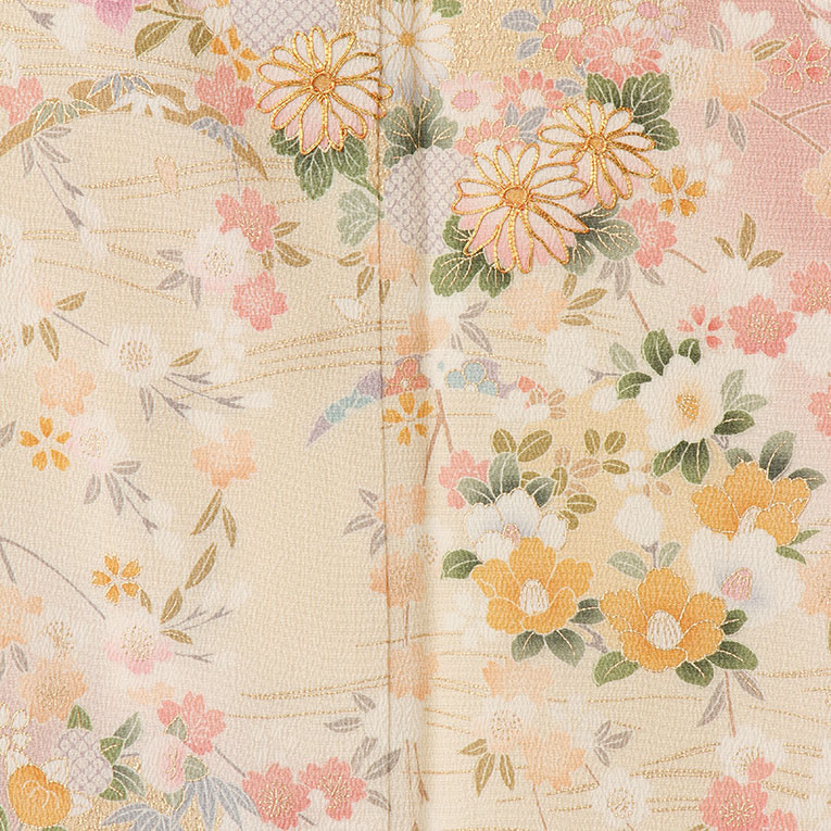 ピンク地に黄色のボカシ、満開に咲く四季の花々が周囲を明るく華やかにしてくれます。