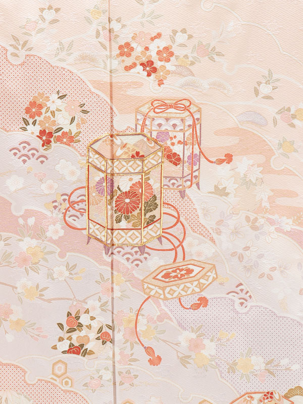ピンクサーモンの地色に大きな雪輪取り、貝桶を中心に四季の花、祝儀の絵柄として好まれています。