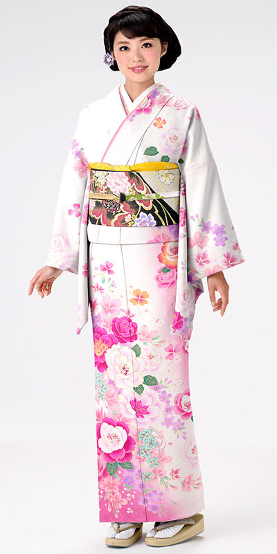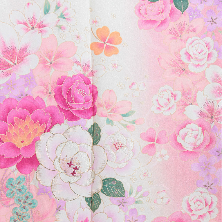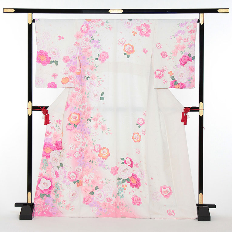 白にピンクの地色。大小の花を散りばめた可愛らしさ溢れるお着物です。