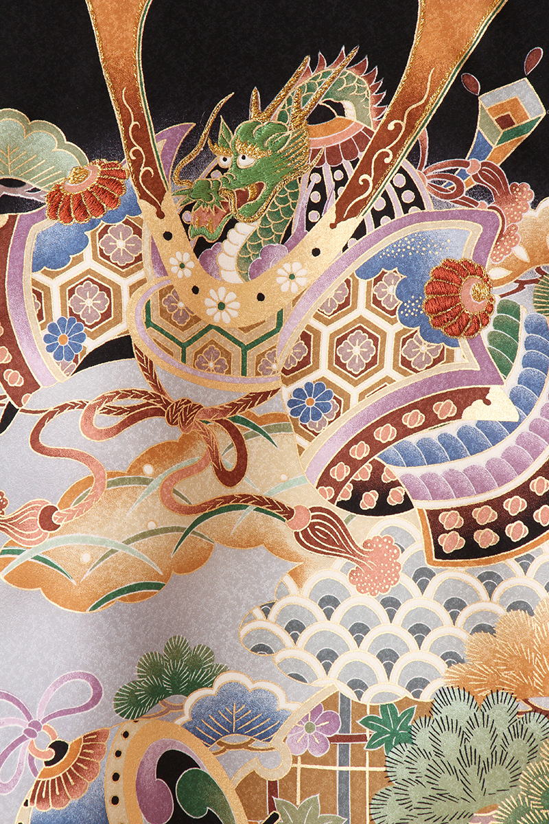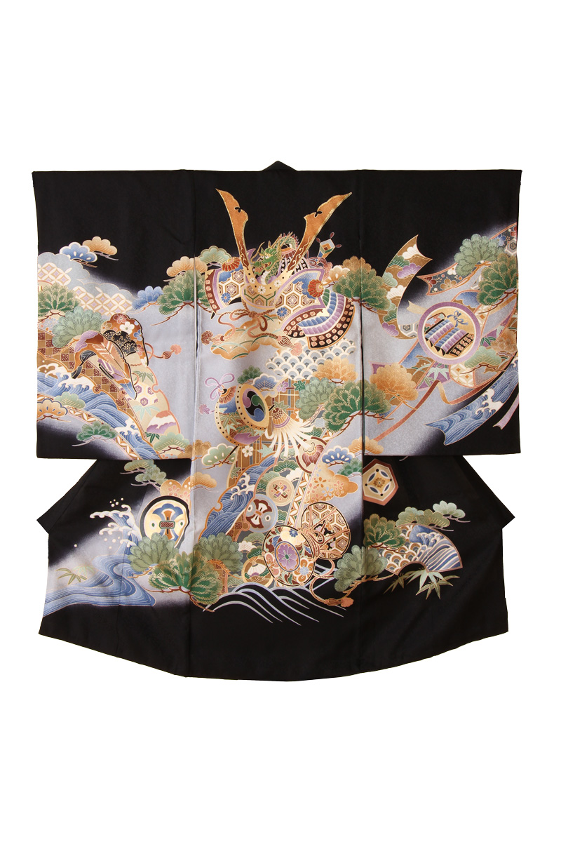 晴れ着の丸昌のお宮参り衣裳黒地に龍と兜柄。裾はグレー地。福徳を呼ぶ宝づくしの文様が描かれています。